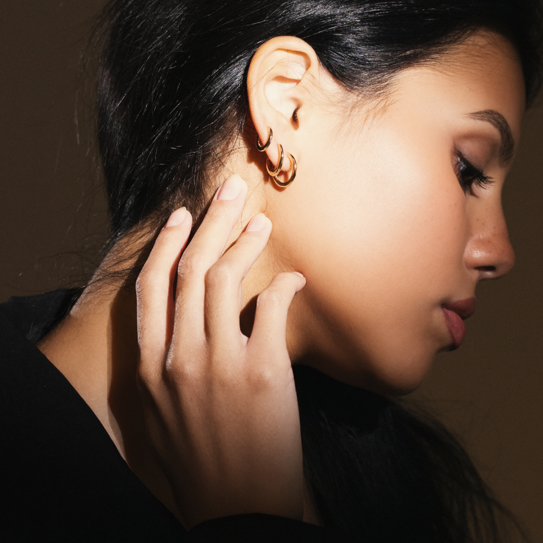 Realizzati in oro rosa, questi orecchini a cerchio sono disponibili in tre misure a scalare, ideali da indossare singolarmente o in combinazione per un effetto contemporaneo e sofisticato.